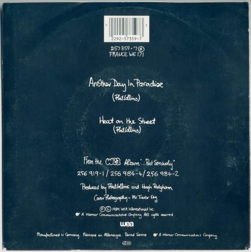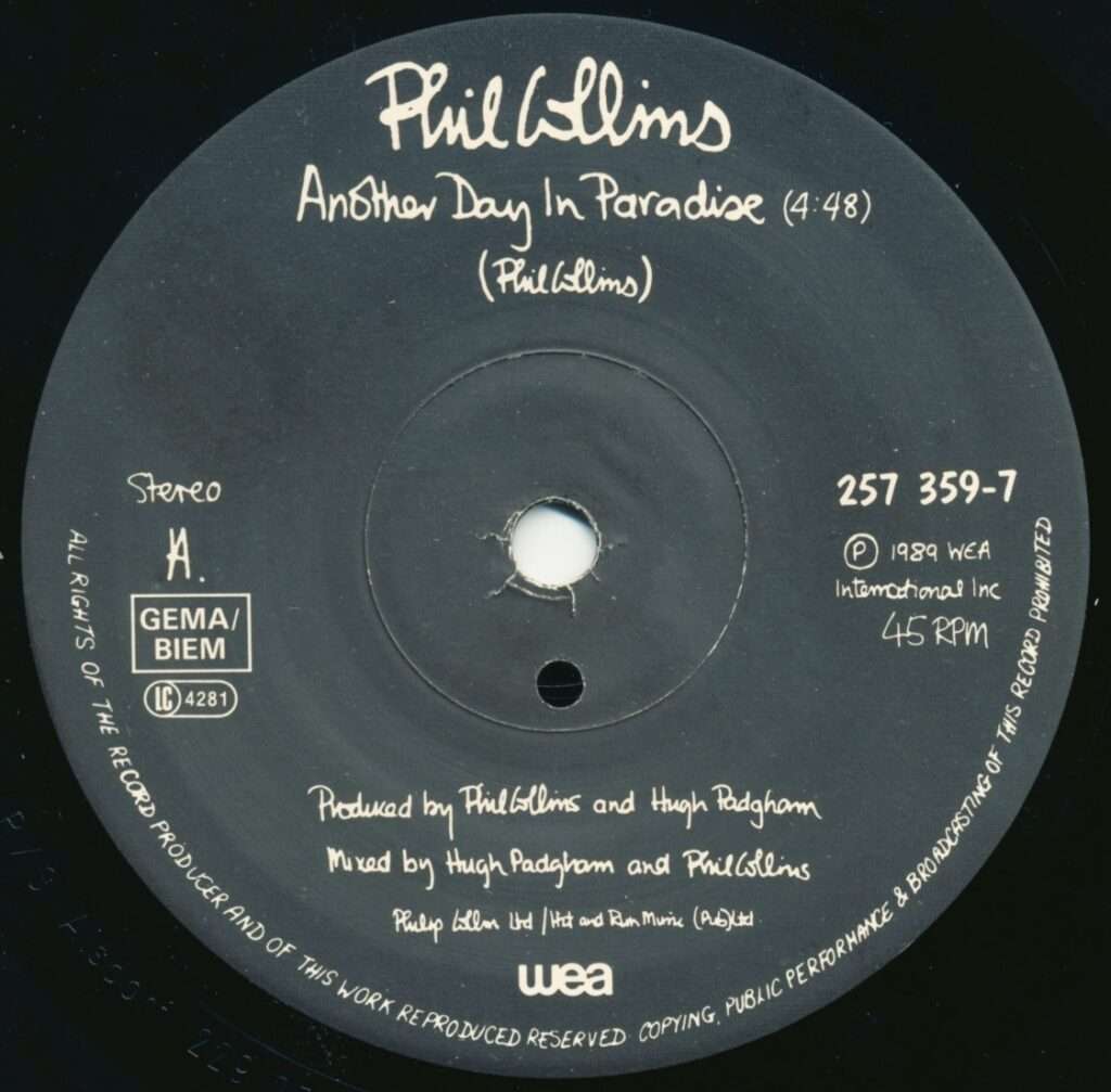 The photograph on the 1989 European 7-inch single of Phil Collins’ “Another Day in Paradise” is a direct, unsmiling close-up of the artist’s face. It was a deliberate choice, signaling that the light, dance-pop sound of his previous work was over. The cover, taken by celebrated photographer and innovator John Trevor Key , demanded that the listener take both the man and his message “more seriously”. The simple, black-and-white image stripped away the trappings of the late-80s pop star. It was a visual mirror of the track inside: a song that challenged listeners to confront a difficult reality.